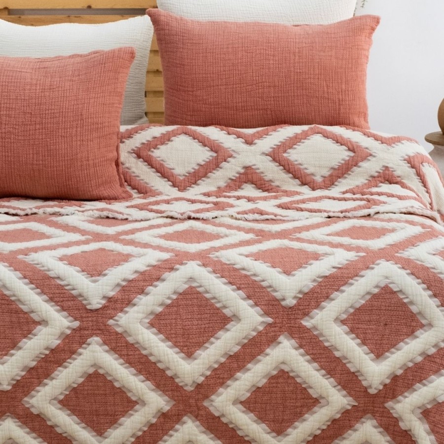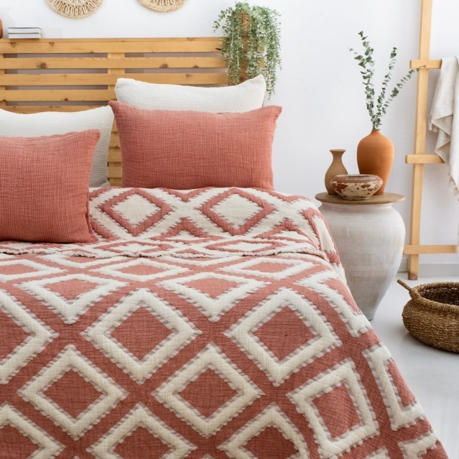 Transformă-ți dormitorul într-un spațiu cald și primitor cu cuvertura Sonia Caramiziu din muselină 100% bumbac de la Saheser Home. Nuanța intensă de cărămiziu, îmbinată cu modelul geometric alb, creează un contrast plin de personalitate, ideal pentru un decor modern și elegant. Este alegerea perfectă pentru cei care doresc să adauge un accent sofisticat și vibrant în amenajarea interioară.