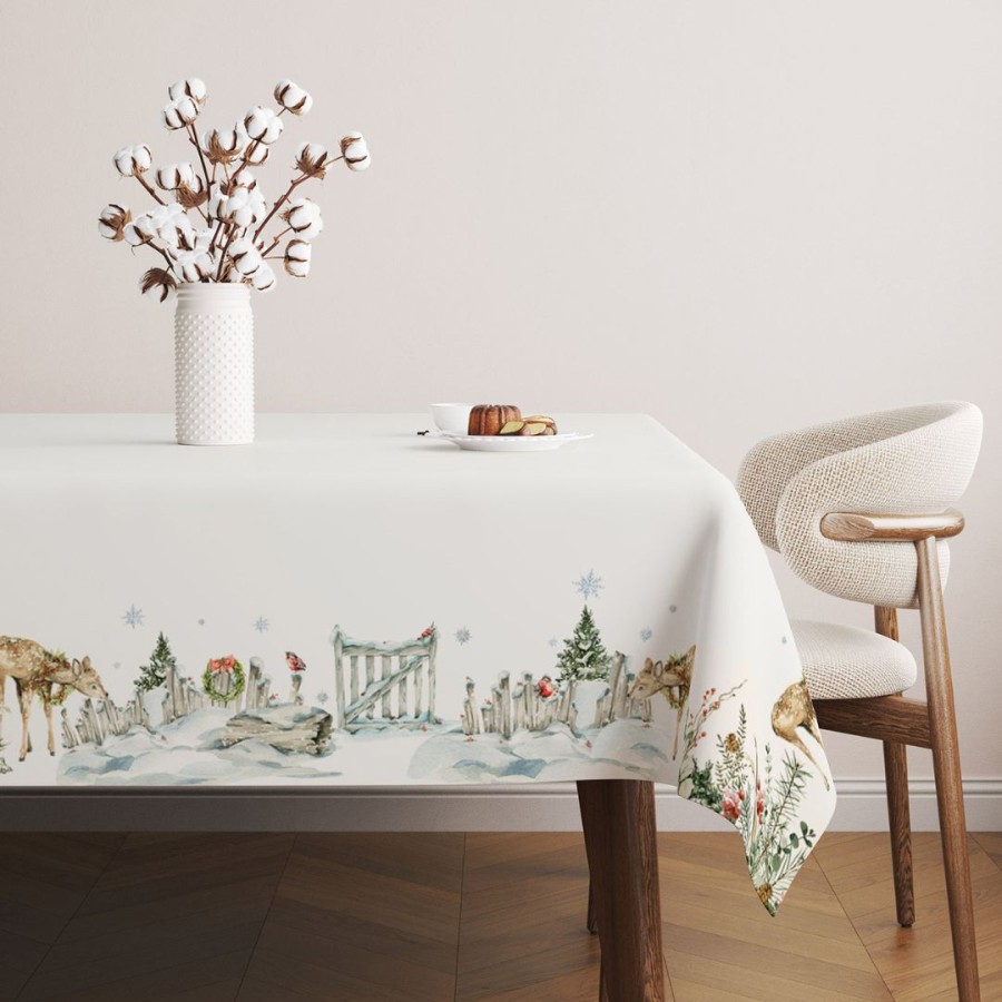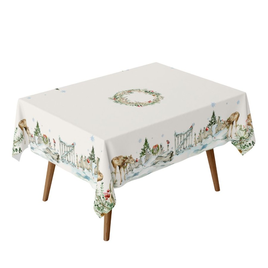 Adaugă o notă de eleganță naturală și farmec de poveste mesei de sărbători cu fața de masă Jasmin, realizată din bumbac 100%. Decorată cu un peisaj de iarnă feeric, reni grațioși și accente botanice delicate, această față de masă aduce în casa ta spiritul autentic al Crăciunului.