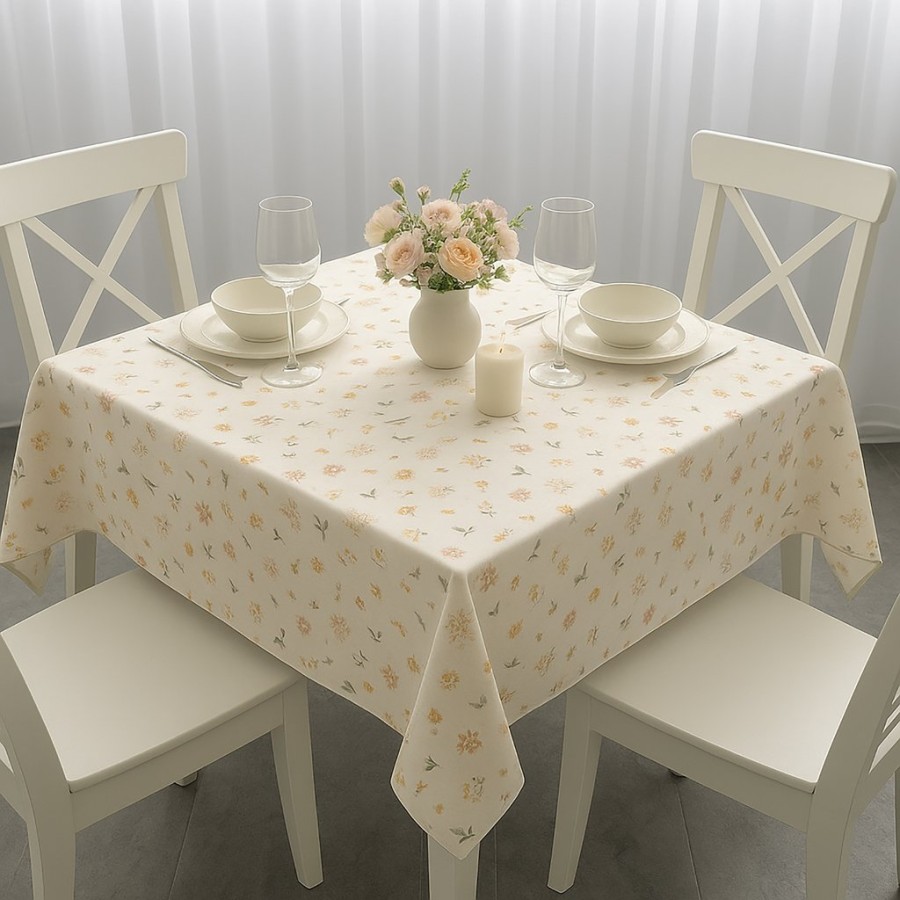 Împrospătează decorul mesei tale cu această față de masă din bumbac teflonat, decorată cu floricele galbene delicate pe fundal crem. Realizată din bumbac 100% premium, moale și plăcut la atingere, este tratată cu teflon pentru a respinge lichidele și petele, oferind un aspect curat și elegant în fiecare zi.
