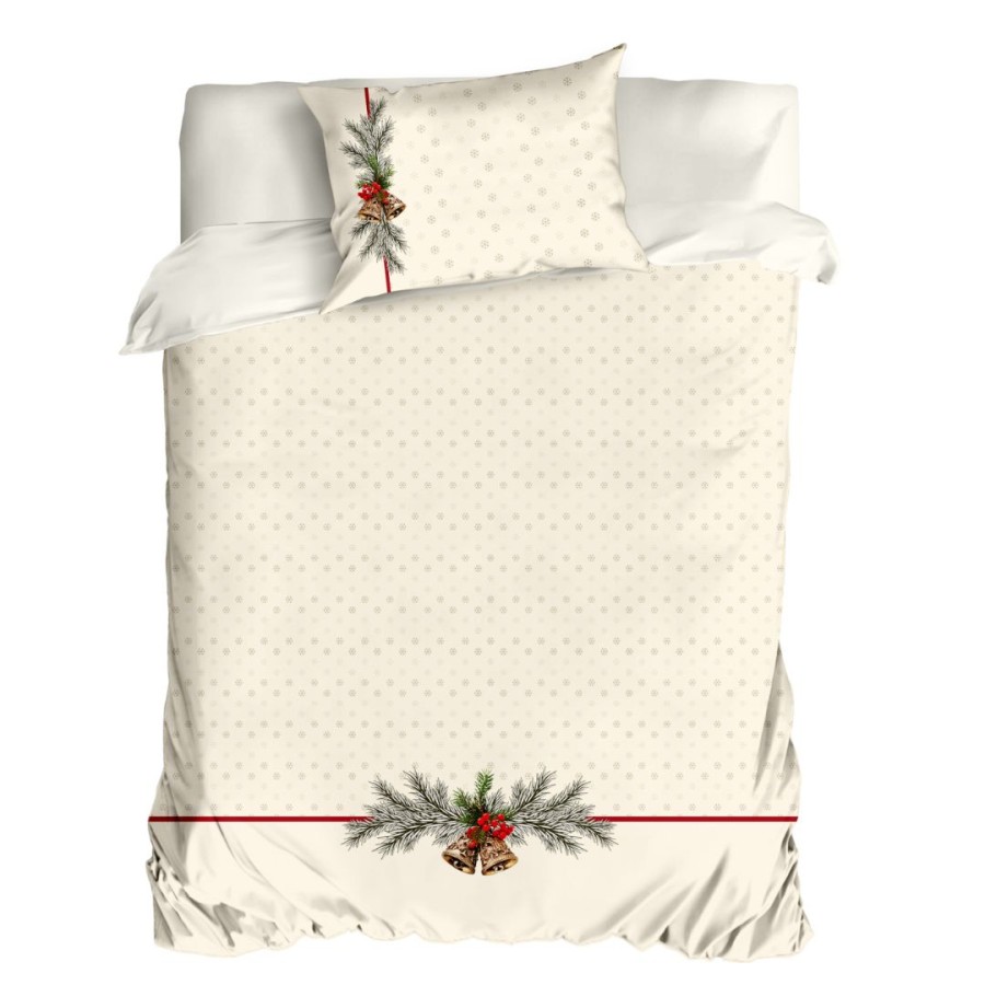 Lenjerie Craciun 3D pat 1 persoana crem cu clopotei si crengute de brad, bumbac 100% ranforce, Holly