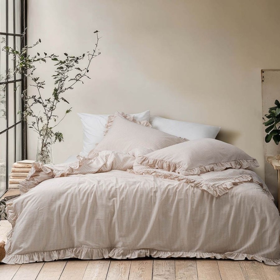 Volanele delicate adaugă o notă romantică și conferă un aspect lejer, dar sofisticat, potrivit atât pentru decoruri rustice, cât și pentru dormitoare moderne cu accente naturale. Materialul moale, respirabil și ușor mat oferă confort deplin și durabilitate în timp, păstrându-și frumusețea după fiecare spălare.