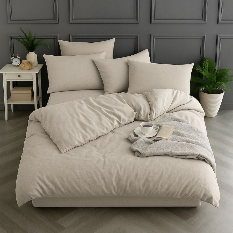 Lenjeria de pat Yarn Dyed Bej aduce în dormitor o eleganță naturală și calmă, datorită texturii sale melanj obținute prin vopsirea firelor înainte de țesere. Nuanțele de bej cald și bej natur se împletesc armonios în țesătură, creând un aspect modern și rafinat, potrivit pentru decoruri minimaliste, boho, nordice sau clasice. Materialul are un look premium, cu o textură discretă ce oferă profunzime vizuală fără a încărca spațiul.