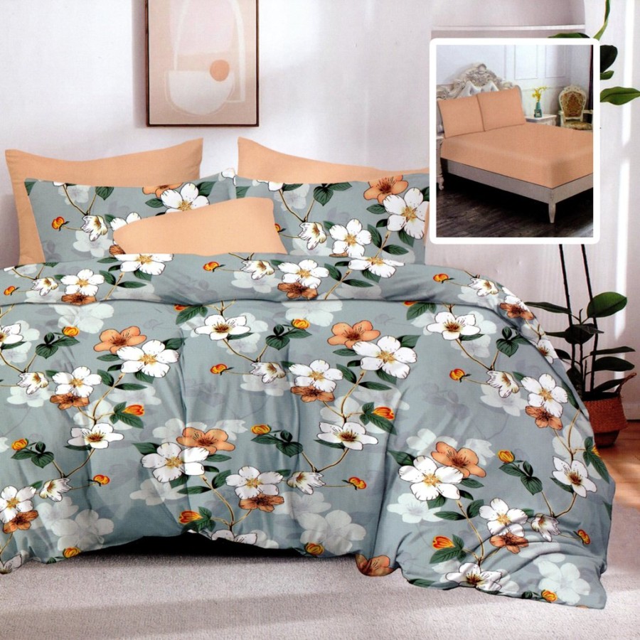 Lenjeria de pat cu 6 piese din finet, flori albe bej, oferă o atmosferă caldă și elegantă în dormitor. Modelul floral cu flori albe și accente bej pe fundal gri deschis aduce un plus de rafinament și echilibru vizual. Cearceaful de pat este prevăzut cu elastic, iar imaginea mică din colț arată modelul acestuia și al fețelor de pernă pătrate. Finetul este moale, plăcut la atingere și ușor de întreținut, fiind ideal pentru utilizare zilnică. Setul conține 6 piese: cearceaf de pat, cearceaf pilotă, 2 fețe de pernă 50x70 cm și 2 fețe de pernă 70x70 cm.
