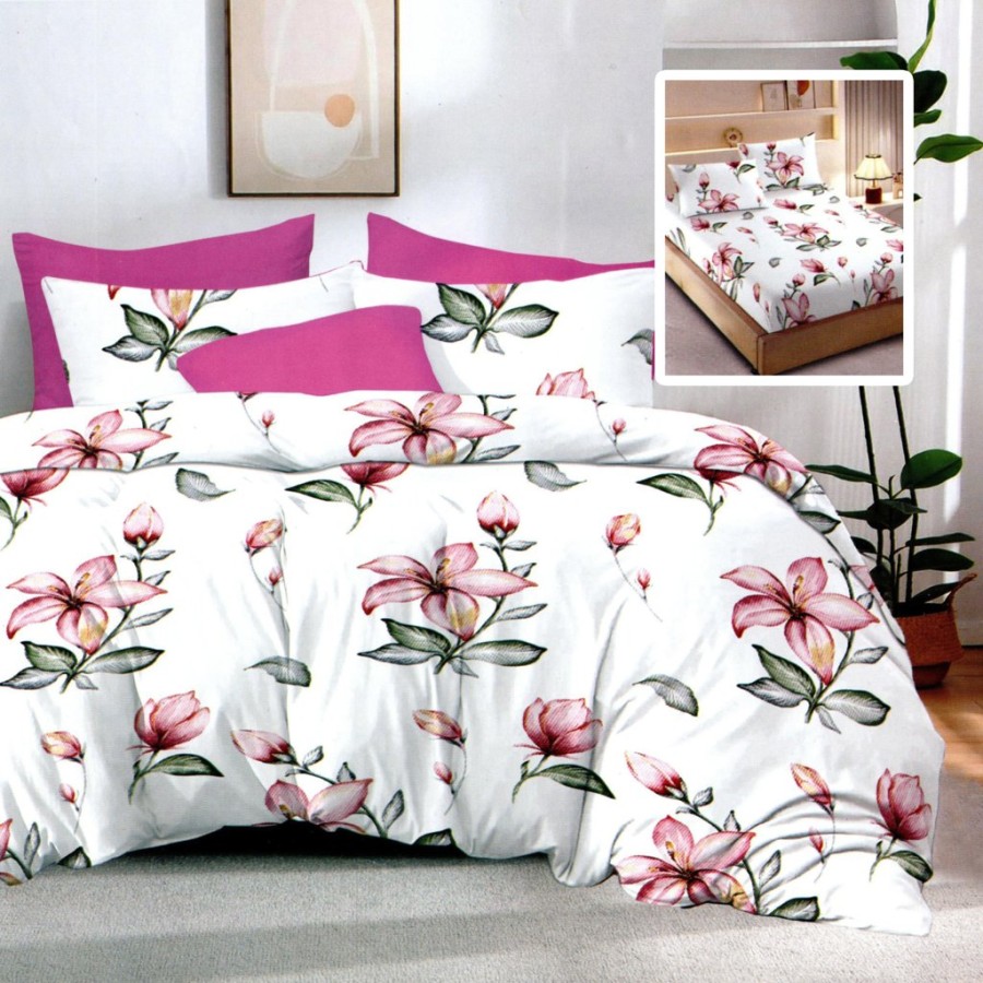 Lenjeria de pat cu 6 piese din finet, flori roz fucsia, transformă dormitorul într-un spațiu elegant și primitor. Modelul floral cu flori mari în nuanțe de roz și fucsia pe fundal alb creează un efect delicat și rafinat. Cearceaful de pat este prevăzut cu elastic, iar imaginea mică din colț arată modelul acestuia și al fețelor de pernă pătrate. Finetul este moale, plăcut la atingere și ușor de întreținut, asigurând confort și durabilitate în timp. Setul conține 6 piese: cearceaf de pat, cearceaf pilotă, 2 fețe de pernă 50x70 cm și 2 fețe de pernă 70x70 cm.