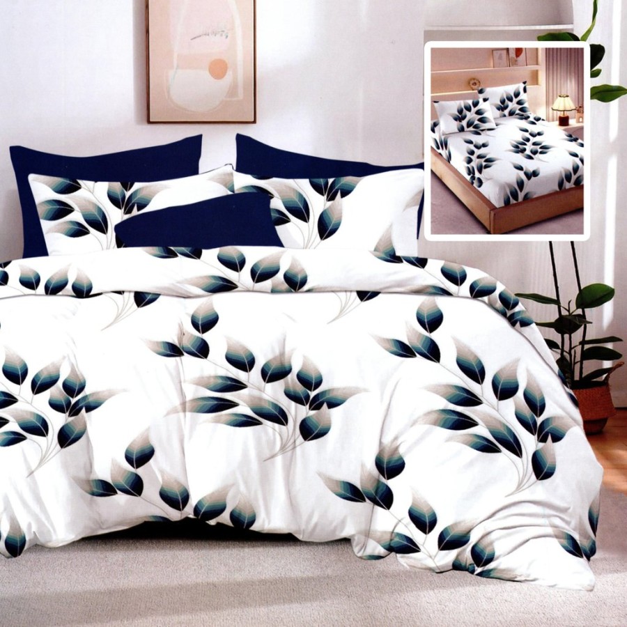 Lenjeria de pat cu 6 piese din finet, frunze bleumarin, adaugă eleganță și rafinament dormitorului tău. Modelul cu frunze în nuanțe de bleumarin și gri pe fundal alb oferă un aspect modern și echilibrat. Cearceaful de pat este prevăzut cu elastic, iar imaginea mică din colț arată modelul acestuia și al fețelor de pernă pătrate. Finetul este moale, plăcut la atingere și ușor de întreținut, asigurând confort și rezistență la spălări repetate. Setul conține 6 piese: cearceaf de pat, cearceaf pilotă, 2 fețe de pernă 50x70 cm și 2 fețe de pernă 70x70 cm.