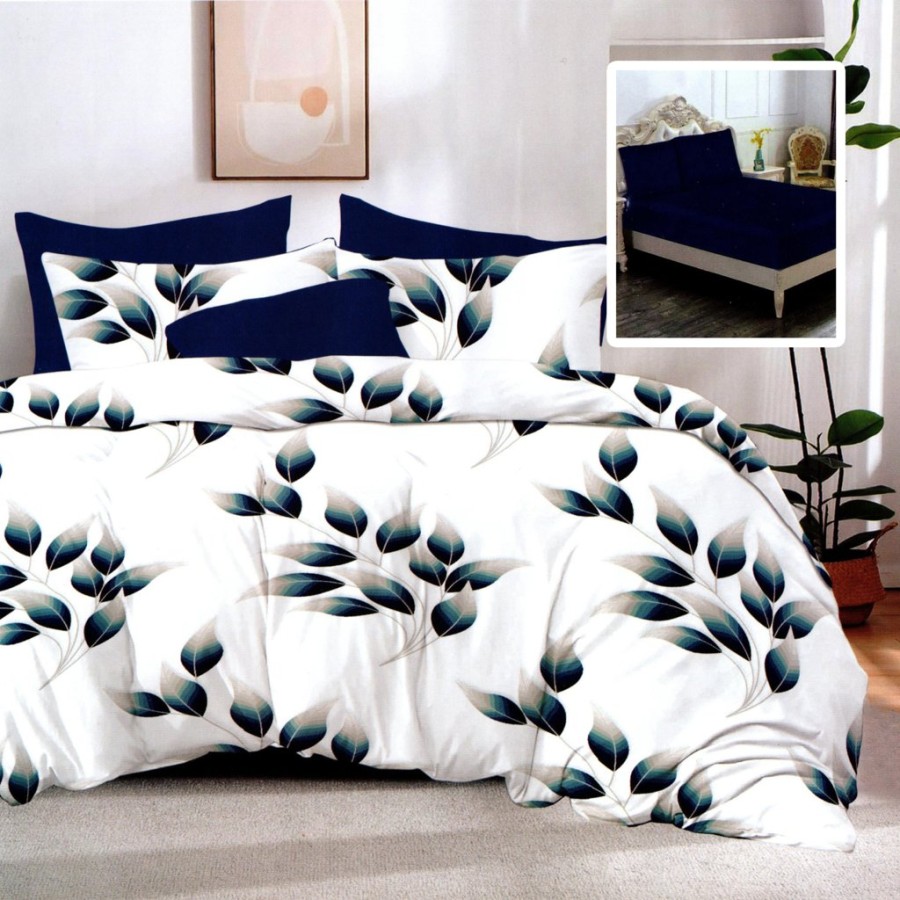 Lenjeria de pat cu 6 piese din finet, frunze, aduce un aer proaspăt și rafinat dormitorului tău. Modelul cu frunze în nuanțe de bleumarin și gri pe fundal alb creează un design elegant și echilibrat, potrivit oricărui stil de amenajare. Cearceaful de pat este prevăzut cu elastic, iar imaginea mică din colț prezintă modelul acestuia și al fețelor de pernă pătrate. Finetul este moale, catifelat la atingere și ușor de întreținut, asigurând confort și rezistență de lungă durată. Setul conține 6 piese: cearceaf de pat, cearceaf pilotă, 2 fețe de pernă 50x70 cm și 2 fețe de pernă 70x70 cm.