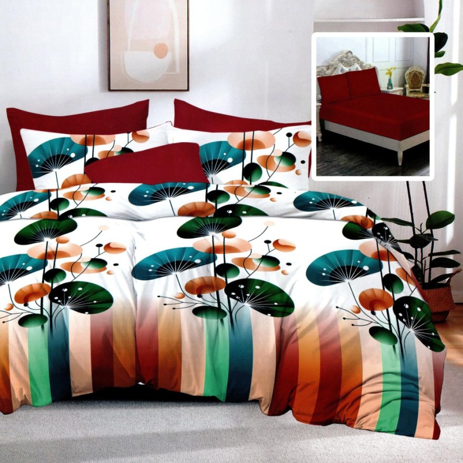 Lenjeria de pat cu 6 piese din finet, frunze roșii verzi, adaugă un plus de stil și prospețime dormitorului tău. Modelul cu frunze abstracte în nuanțe de verde, roșu și portocaliu pe fundal alb oferă un design modern și plin de personalitate. Cearceaful de pat este prevăzut cu elastic, iar imaginea mică din colț arată modelul acestuia și al fețelor de pernă pătrate. Finetul este moale, plăcut la atingere și ușor de întreținut, garantând confort și durabilitate în timp. Setul conține 6 piese: cearceaf de pat, cearceaf pilotă, 2 fețe de pernă 50x70 cm și 2 fețe de pernă 70x70 cm.