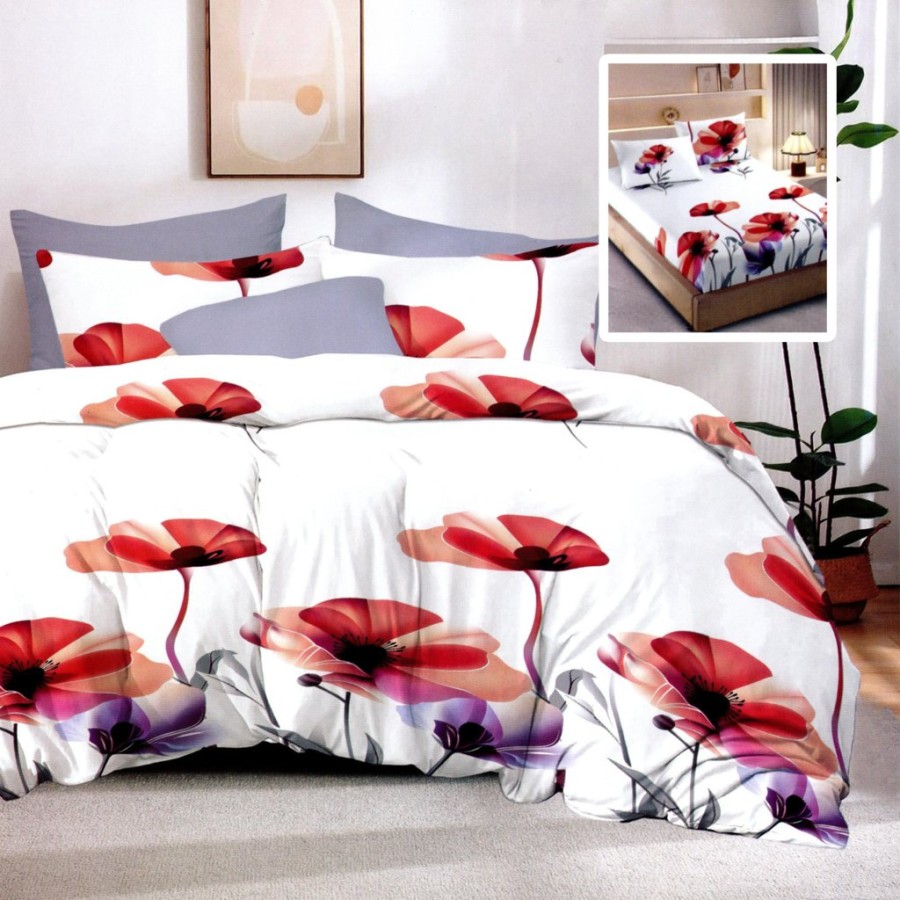 Lenjeria de pat cu 6 piese din finet, maci roșii, aduce prospețime și eleganță în dormitorul tău. Modelul cu flori mari de maci în nuanțe de roșu și mov pe fundal alb oferă un design plăcut și armonios. Cearceaful de pat este prevăzut cu elastic, iar imaginea mică din colț prezintă modelul acestuia și al fețelor de pernă pătrate. Finetul este moale, plăcut la atingere și ușor de întreținut, asigurând confort și durabilitate în timp. Setul conține 6 piese: cearceaf de pat, cearceaf pilotă, 2 fețe de pernă 50x70 cm și 2 fețe de pernă 70x70 cm.