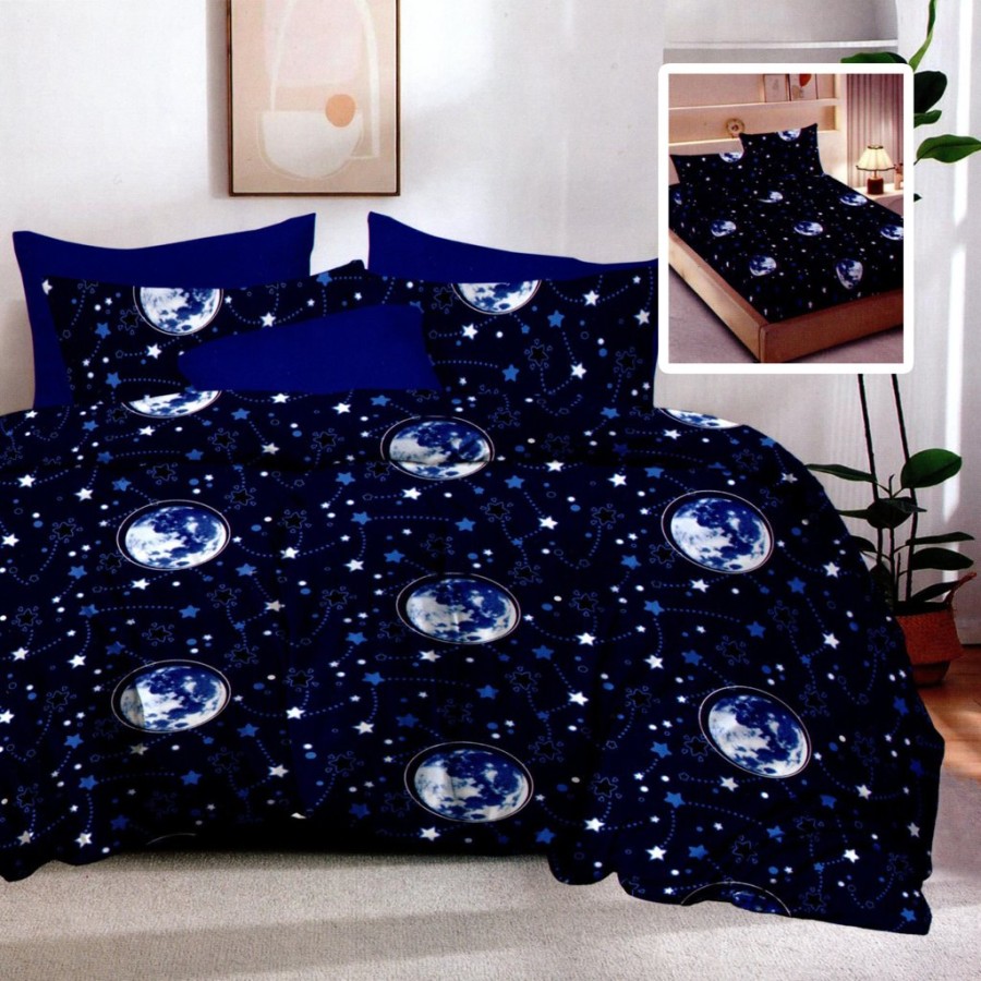 Lenjeria de pat cu 6 piese din finet, planete și stele, oferă un design modern și spectaculos, perfect pentru pasionații de astronomie. Modelul cu planete albastre, stele și constelații pe fundal bleumarin creează o atmosferă unică și relaxantă. Cearceaful de pat este prevăzut cu elastic, iar imaginea mică din colț arată modelul acestuia și al fețelor de pernă pătrate. Finetul este moale, plăcut la atingere și ușor de întreținut, asigurând confort și durabilitate în timp. Setul conține 6 piese: cearceaf de pat, cearceaf pilotă, 2 fețe de pernă 50x70 cm și 2 fețe de pernă 70x70 cm.