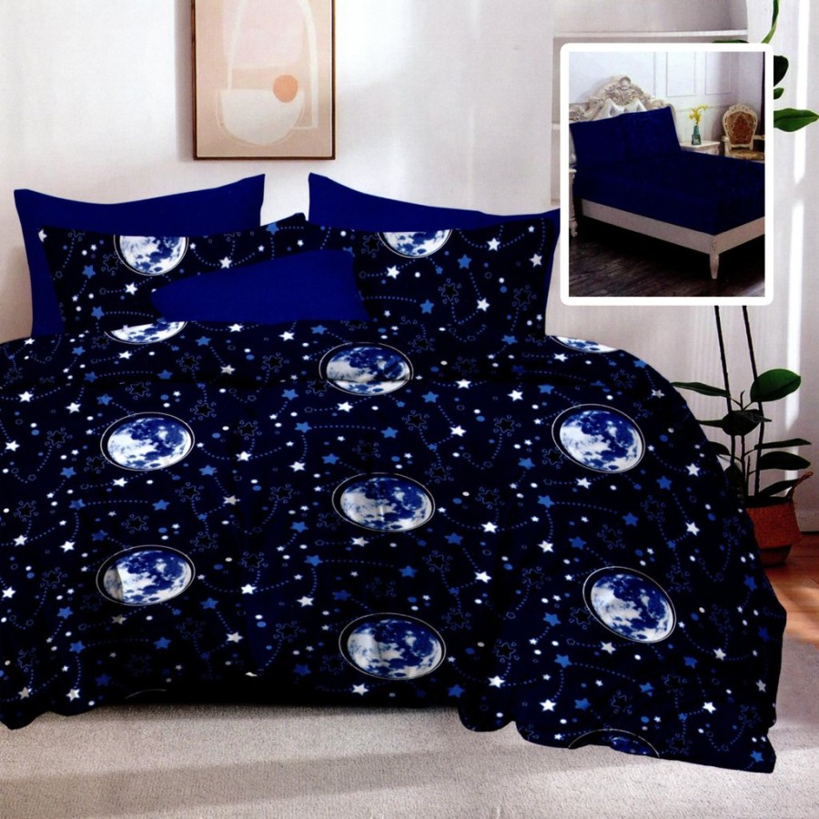 Lenjeria de pat cu 6 piese din finet, univers albastru închis, oferă dormitorului tău un aspect modern și spectaculos. Modelul cu planete, stele și constelații pe fundal albastru închis creează o atmosferă relaxantă, inspirată de cerul nopții. Cearceaful de pat este prevăzut cu elastic, iar imaginea mică din colț prezintă modelul acestuia și al fețelor de pernă pătrate. Finetul este moale, plăcut la atingere și ușor de întreținut, asigurând confort și durabilitate în timp. Setul conține 6 piese: cearceaf de pat, cearceaf pilotă, 2 fețe de pernă 50x70 cm și 2 fețe de pernă 70x70 cm.