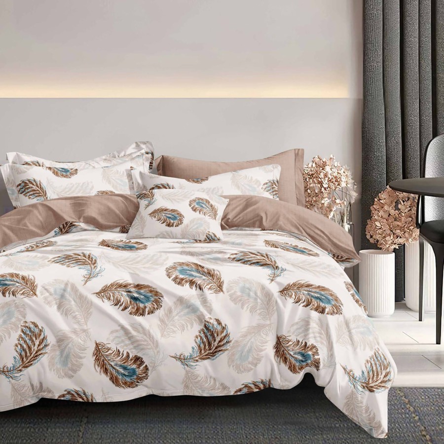 Lenjerie de pat dublu din finet cu elastic, model cu pene în nuanțe de albastru și maro pe fundal alb, cu fețe de pernă și cearșafuri în tonuri de bej, set 6 piese.