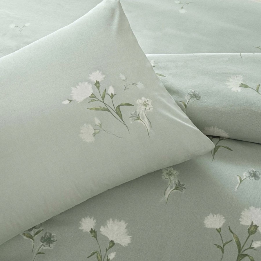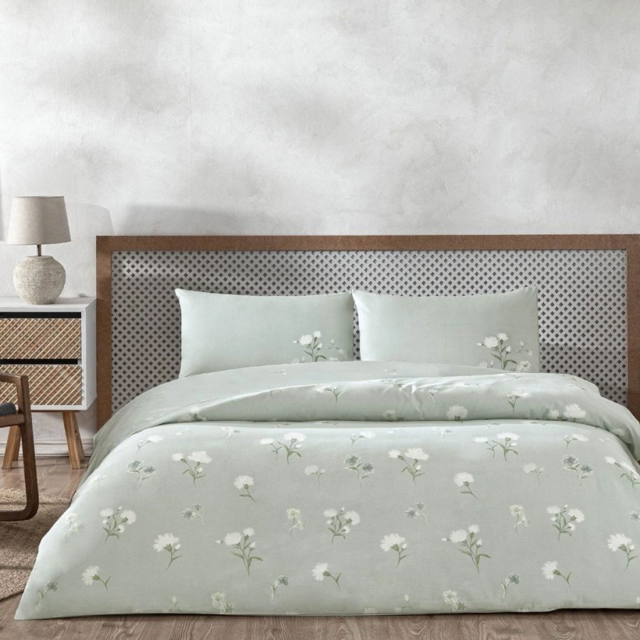 Transformă-ți dormitorul într-un spațiu calm și luminos cu lenjeria de pat Aveste de la TAC. Modelul floral discret, cu flori albe fine pe un fond verde-salvie pal, inspiră prospețime și rafinament natural. Țesătura din bumbac 100% ranforce oferă un echilibru ideal între finețe, rezistență și respirabilitate, asigurând confort în orice anotimp.