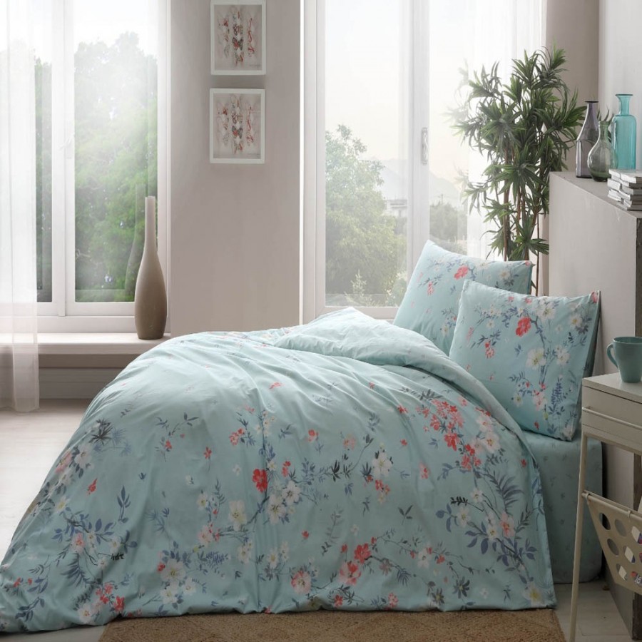 Lenjerie de pat dublu din bumbac 100% ranforce, decorată cu un model floral delicat în nuanțe de albastru, roz și alb, pe fundal verde mint, oferind un aspect proaspăt și elegant.