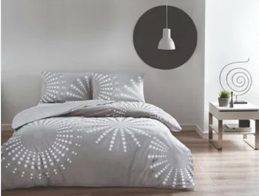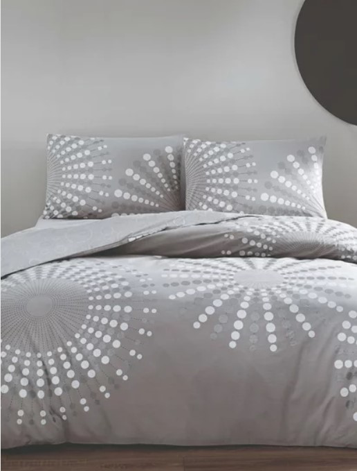 Lenjerie de pat dublu din bumbac 100% Ranforce, model Moon, cu un design modern de cercuri albe pe fundal gri, oferind un aspect elegant și contemporan dormitorului tău.