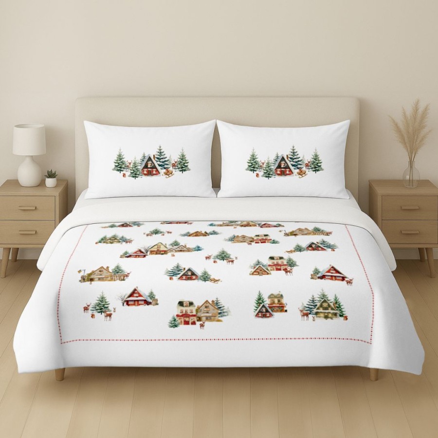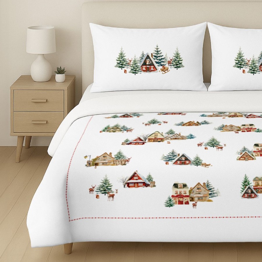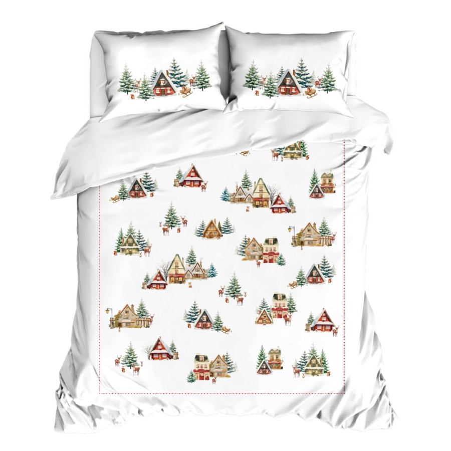 Modelul 3D redă cu finețe cabane de munte, brazi ninși și detalii de Crăciun în nuanțe armonioase de alb, verde și roșu, creând un decor festiv elegant și liniștitor. Țesătura din bumbac ranforce este moale, rezistentă și plăcută la atingere, ideală pentru un somn confortabil în sezonul rece.