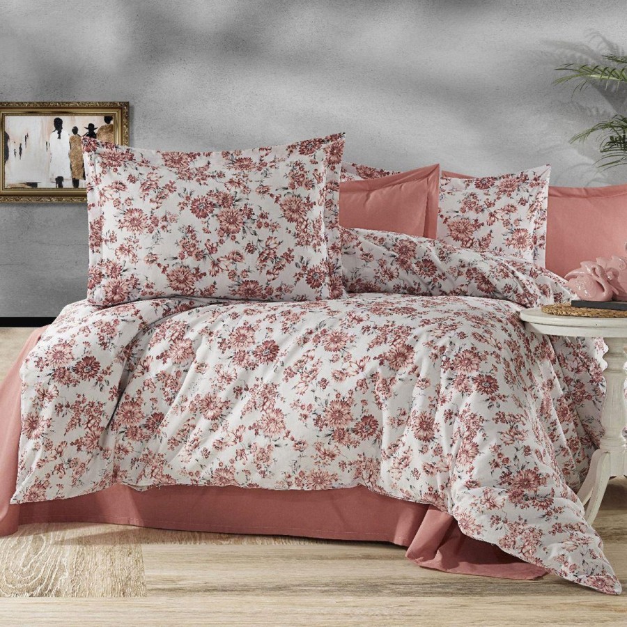 Lenjerie de pat dublu cu imprimeu de crizanteme în nuanțe de roz și maro pe fundal alb, realizată din bumbac sanforizat. Set de 4 piese. Cearceaful de pilotă și fețele de pernă au un imprimeu floral de crizanteme roz și maro pe fundal alb, iar cearceaful de pat este roz uni.