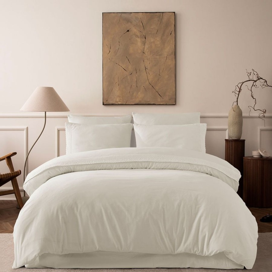Lenjeria de pat Lavinya Dove ecru impresionează prin eleganța liniilor simple și finețea detaliilor croșetate. Nuanța caldă de ecru și textura mată a bumbacului ranforce prespălat oferă dormitorului o atmosferă calmă, naturală și sofisticată.