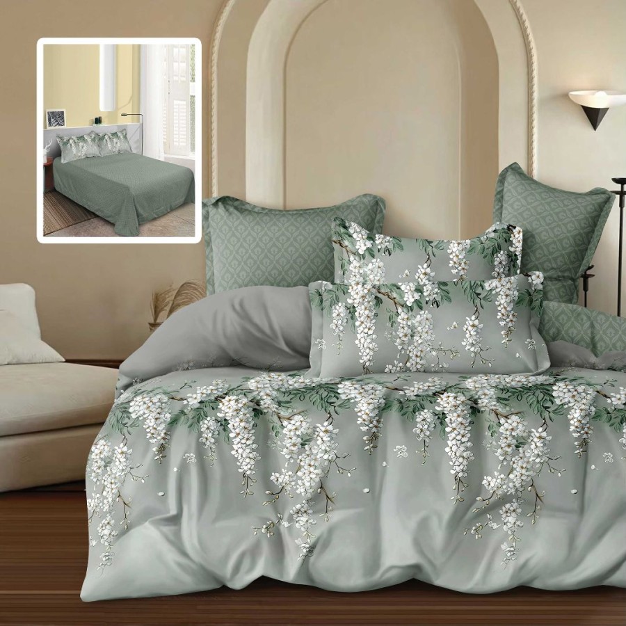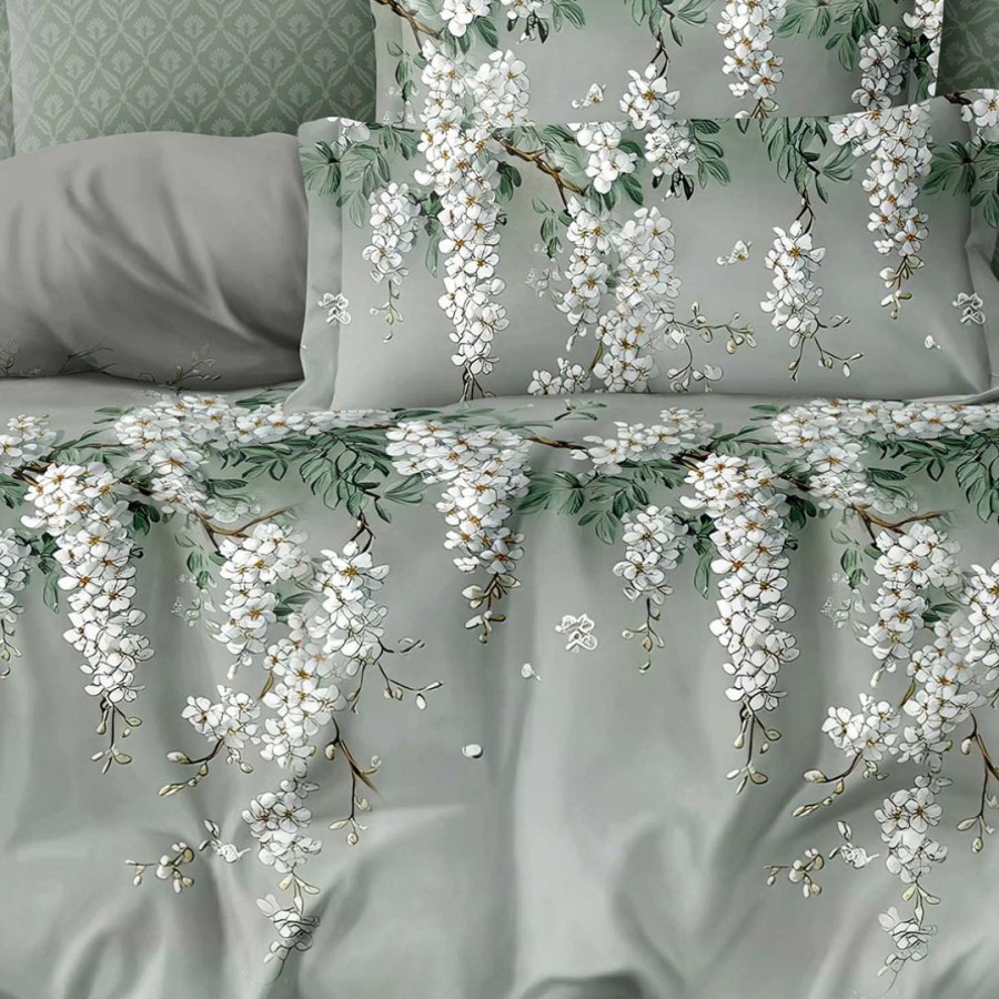 Învăluie-ți dormitorul în eleganță și prospețime cu această lenjerie de pat dublu din finet, decorată cu flori delicate de glicină albă, dispuse în ciorchini grațioși pe fundal verde pastel. Designul floral atârnător aduce un aer romantic și rafinat, creând o atmosferă calmă și relaxantă.