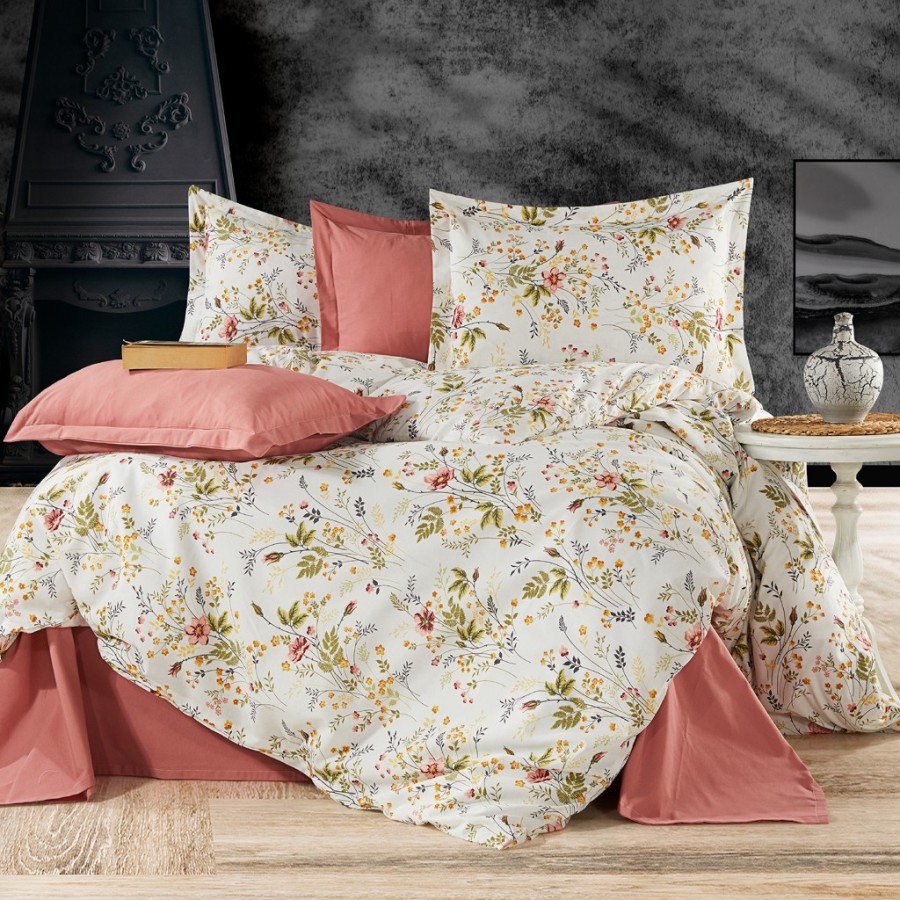 Lenjerie de pat dublu ranforce 4 piese flori somon