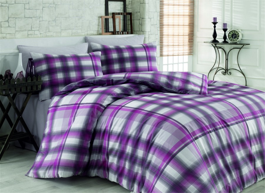 Lenjerie de pat ranforce Bahar Home, model Fantasia, cu un design clasic în carouri mov, alb și gri, oferind un aspect elegant și sofisticat dormitorului tău.