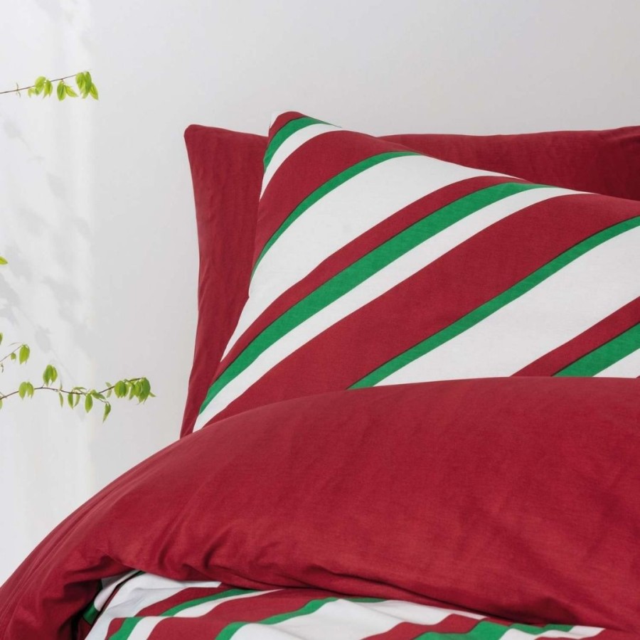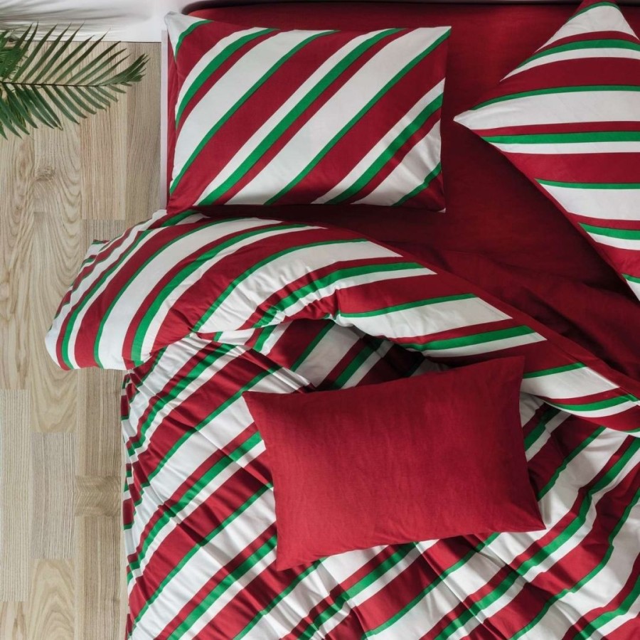 Modelul modern, cu dungi diagonale în nuanțe vibrante de roșu, verde și alb, oferă o notă veselă și elegantă camerei tale, fiind ideal pentru sezonul rece. Țesătura naturală din bumbac ranforce asigură o textură moale, respirabilă și plăcută la atingere, perfectă pentru un somn confortabil.