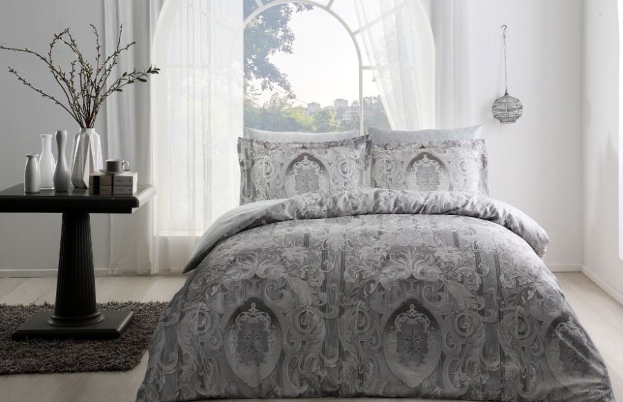 Lenjerie de pat dublu satin de lux TAC model Grona gri cu imprimeu baroc digital, fabricată din 100% bumbac satinat.