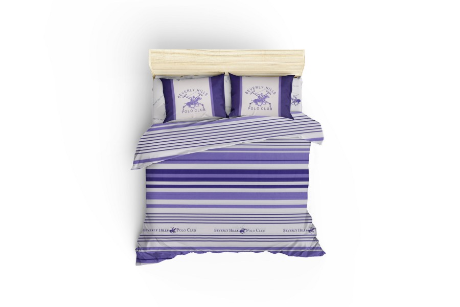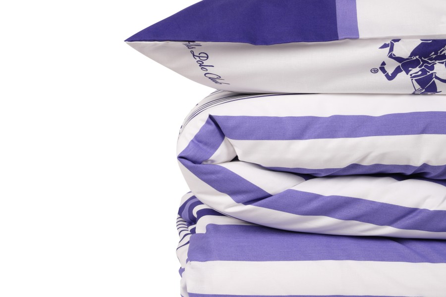 Lenjerie de pat din bumbac 100% ranforce, Beverly Hills Polo Club, cu dungi orizontale albastre și albe, și fețe de pernă cu logo-ul iconic.