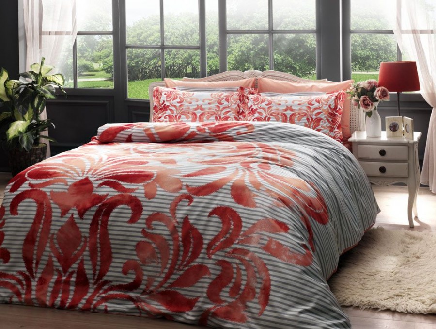 Lenjerie de pat din bumbac 100% satinat, model Fabrice Roșu, cu design floral și dungi în nuanțe de roșu și gri, aducând un plus de eleganță și prospețime dormitorului tău.