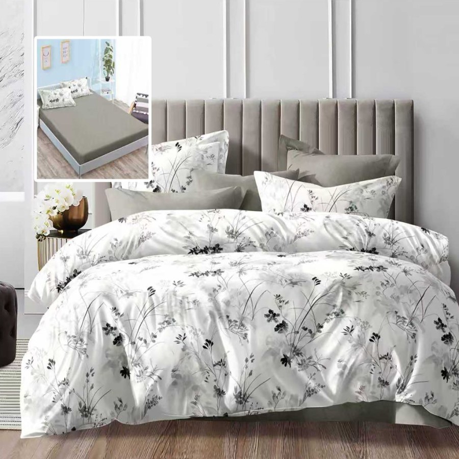 Lenjeria de pat dublu 6 piese cu elastic, floral gri, este realizata din bumbac si include husa cu elastic, cearceaf de pilota, 2 fete de perna dreptunghiulare si 2 fete de perna patrate. Design alb cu imprimeu floral gri si husa uni gri deschis.