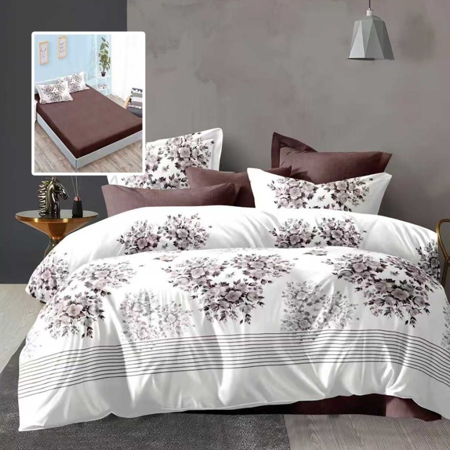 Lenjerie de pat dublu 6 piese cu elastic, flori mov gri are un imprimeu floral elegant in nuante de mov, gri si alb pe fundal deschis. Cearceaful de pat cu elastic este uni maro inchis, asa cum se vede clar in poza mica aplicata peste imaginea principala. Fetele de perna imbina imprimeul floral cu nuante simple de maro pentru un aspect cald si armonios.