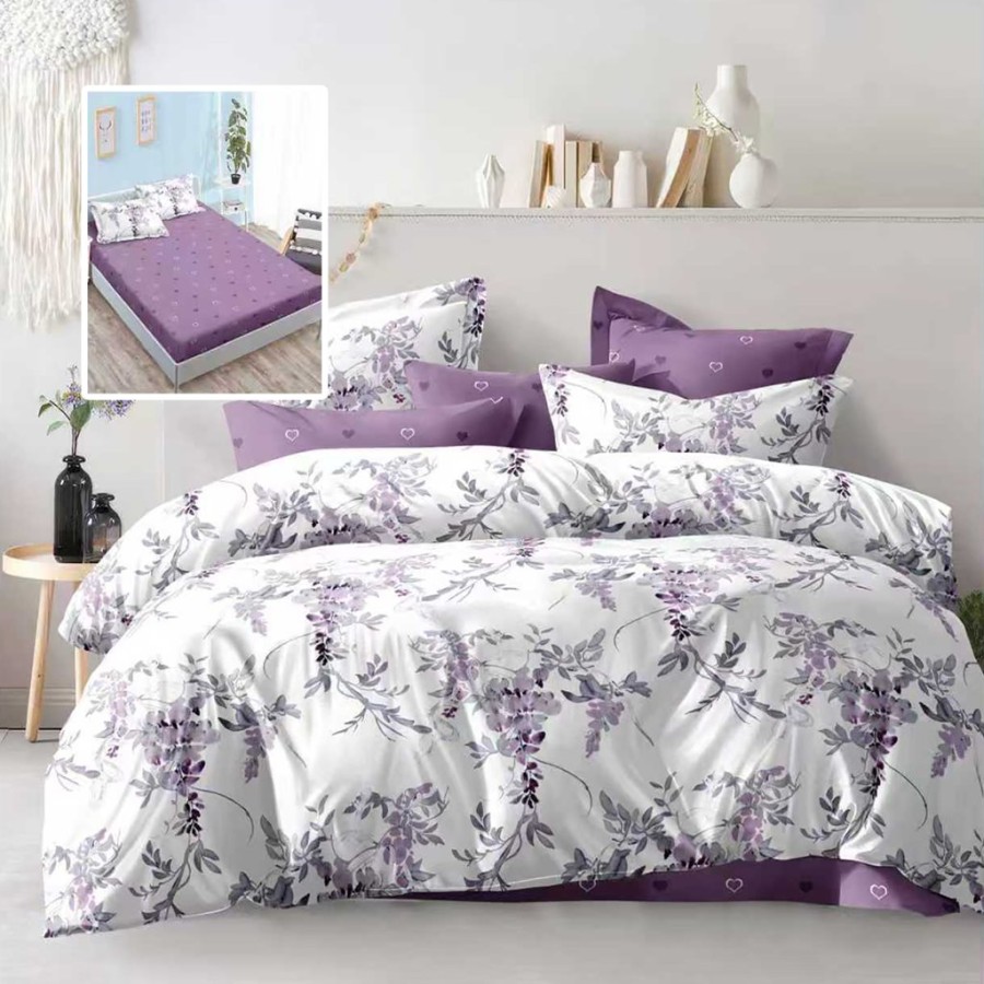 Lenjerii 1+1 gratis: Lenjerie de pat dublu 6 piese cu elastic, flori mov lila