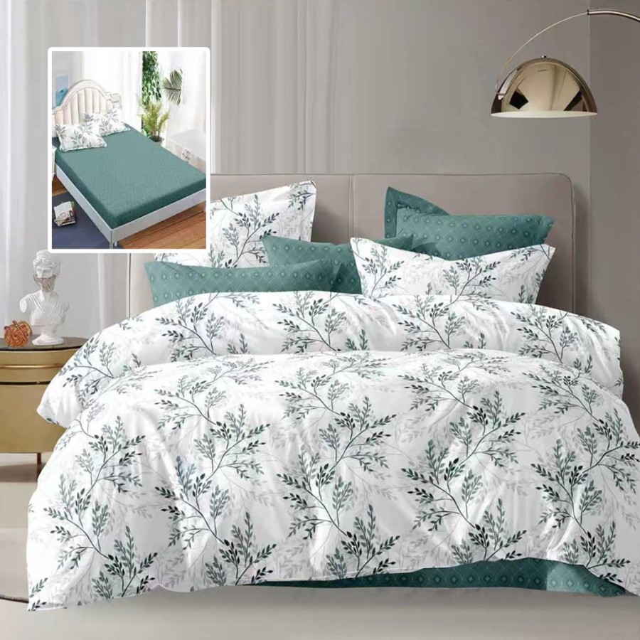 Lenjerie de pat dublu 6 piese cu elastic, cu imprimeu frunze verzi pe fundal alb si cearceaf de pat verde uni cu elastic. Setul are 2 fete de perna dreptunghiulare, 2 fete patrate, cearceaf cu elastic si cearceaf de pilota.