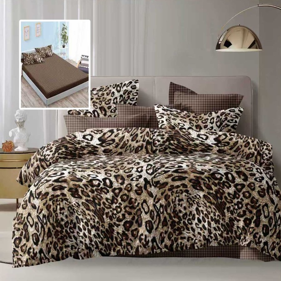 Lenjerie de pat dublu 6 piese cu elastic, imprimeu leopard, realizata din bumbac, cu cearsaful de pat maro cu model discret si cearsaful de pilota in imprimeu leopard. Setul include 1 cearsaf cu elastic, 1 cearsaf de pilota, 2 fete de perna dreptunghiulare si 2 fete de perna patrate, toate asortate in aceeasi tematica.