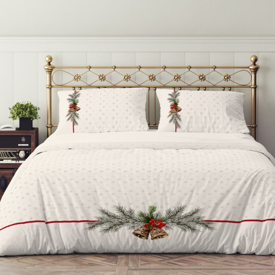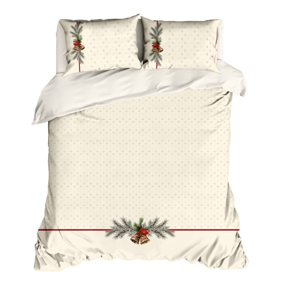 Lenjerii Craciun 3D pat dublu crem cu clopotei si crengute de brad, bumbac 100% ranforce, Holly