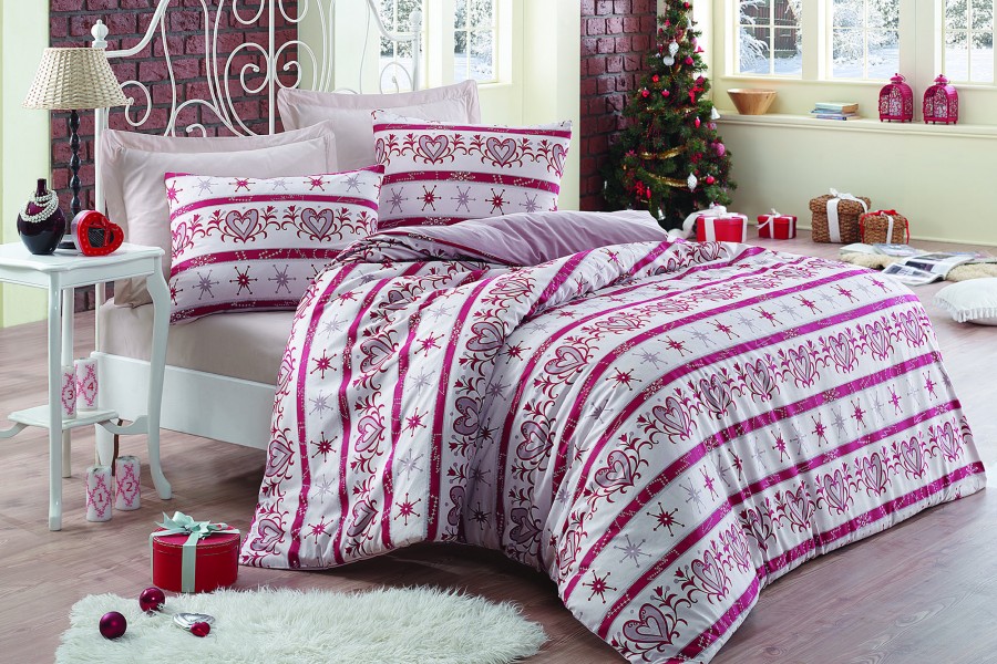 Lenjerie de pat din bumbac ranforce, cu un design festiv de Crăciun, în nuanțe de roșu și alb, cu modele de inimi, stele și linii elegante, ideală pentru sărbători.