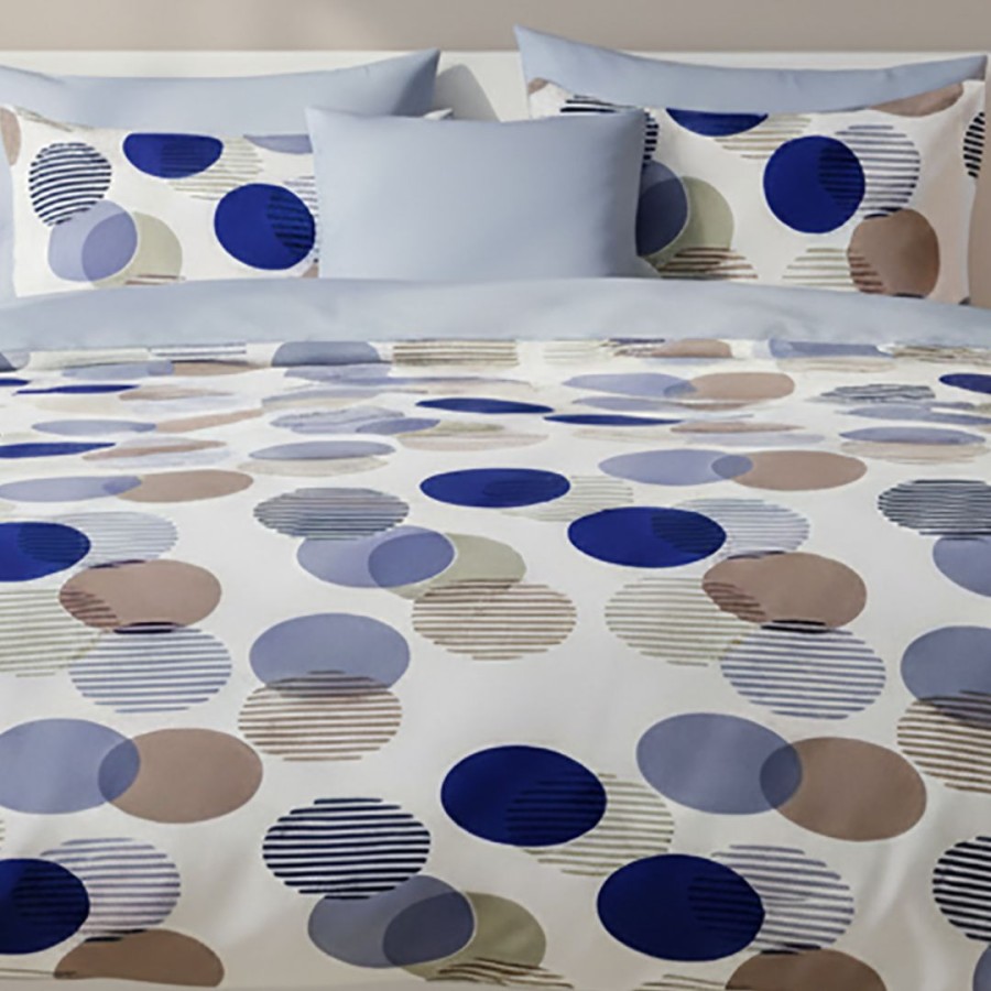 Lenjeria de pat cu cercuri albastre din Colecția Elvo aduce un plus de stil și echilibru vizual în dormitorul tău. Modelul geometric, în nuanțe de albastru marin, bej și gri deschis, creează un efect modern și armonios, potrivit atât pentru interioare minimaliste, cât și pentru decoruri contemporane.
