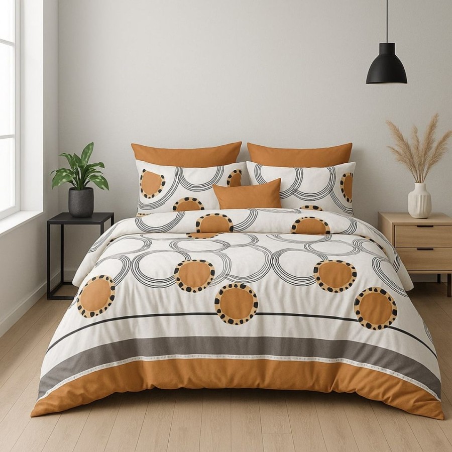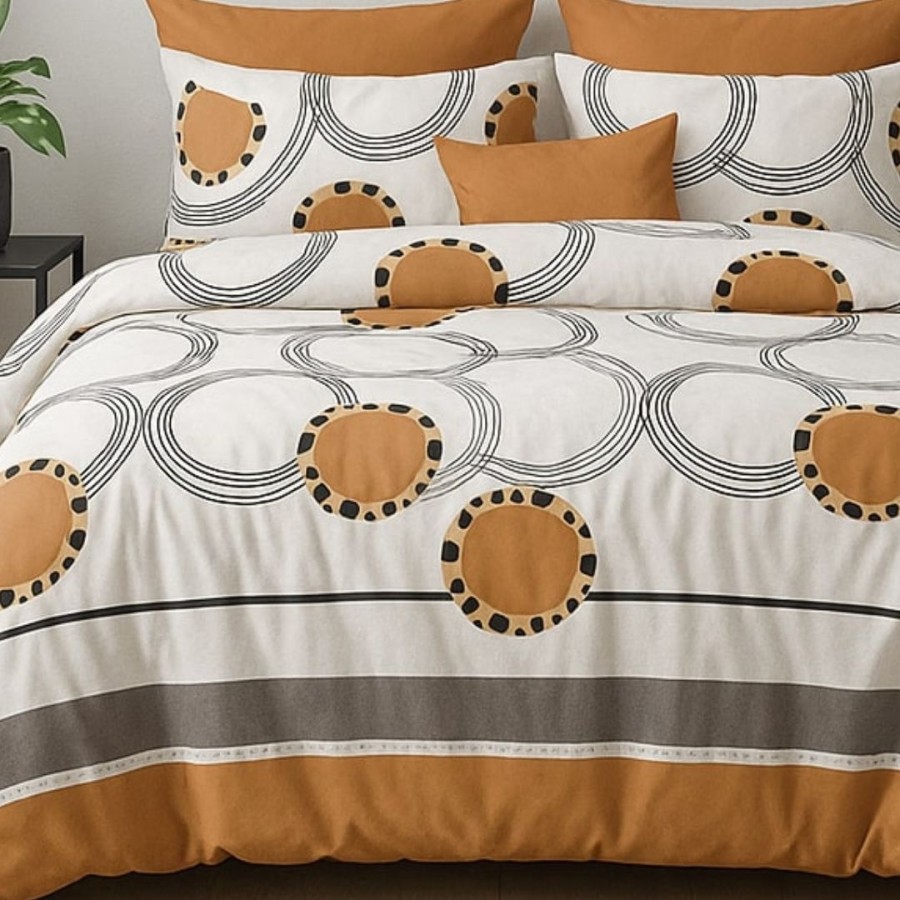 Lenjeria de pat cu cercuri maro aduce un aer modern și cald în dormitorul tău, prin combinația armonioasă de tonuri caramel, maro și alb. Designul geometric cu cercuri concentrice creează un efect vizual echilibrat, perfect pentru interioare contemporane și minimaliste.