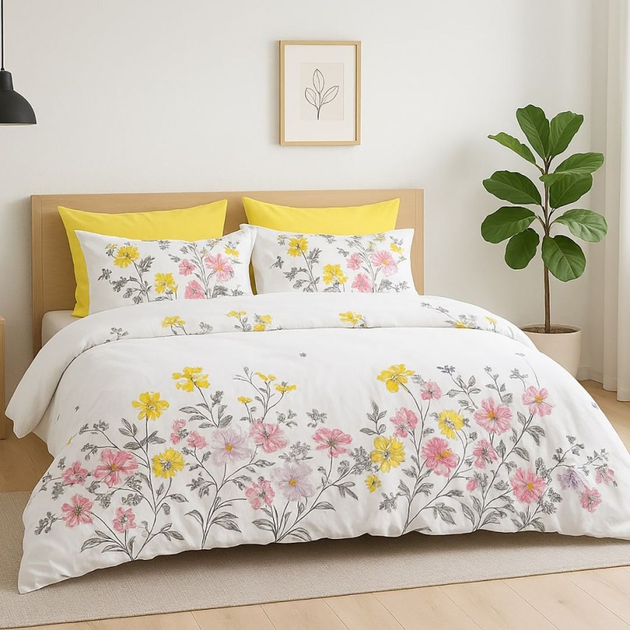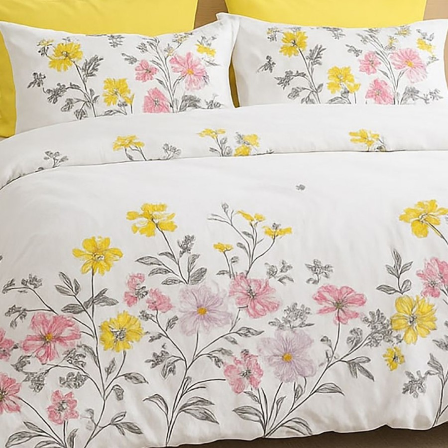 Lenjeria de pat cu flori colorate din Colecția Elvo aduce un strop de prospețime și energie pozitivă în dormitorul tău. Modelul floral, cu flori roz și galbene în nuanțe pastel, pe fond alb luminos, creează o atmosferă senină și primitoare, perfectă pentru un decor modern cu accente naturale.