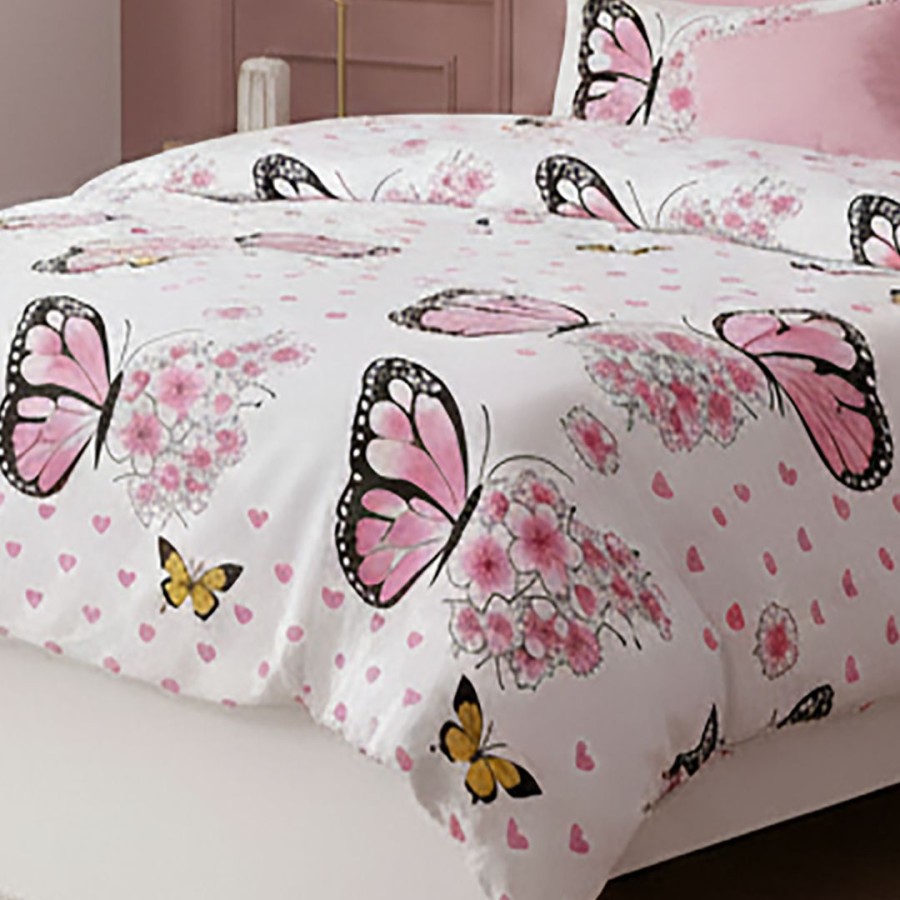 Lenjeria de pat cu fluturi roz din Colecția Elvo transformă dormitorul într-un spațiu romantic și luminos. Imprimeul delicat, cu fluturi roz și galbeni printre flori pastelate, pe fond alb, aduce o notă de prospețime și feminitate perfectă pentru un decor elegant și rafinat.
