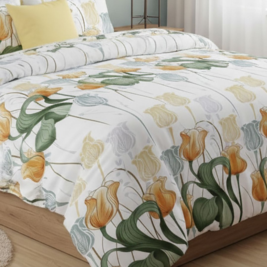 Lenjeria de pat cu lalele galbene din Colecția Elvo aduce luminozitate și prospețime în dormitorul tău. Modelul elegant cu lalele galbene și verzi pe fond alb evocă frumusețea primăverii, oferind un decor plin de viață, echilibrat și armonios.