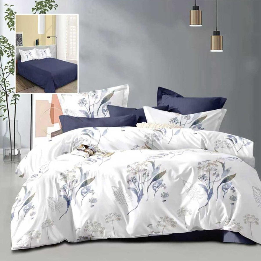 Lenjerie de pat dublu, flori albastre pastel prezinta un imprimeu delicat cu flori si frunze in nuante de albastru pastel, gri si bej pe fundal alb. Cearceaful de pat este drept, uni albastru inchis, asa cum se observa clar in poza mica aplicata peste imaginea principala. Fetele de perna combina imprimeul floral cu nuante simple de albastru inchis pentru un aspect modern si bine echilibrat.