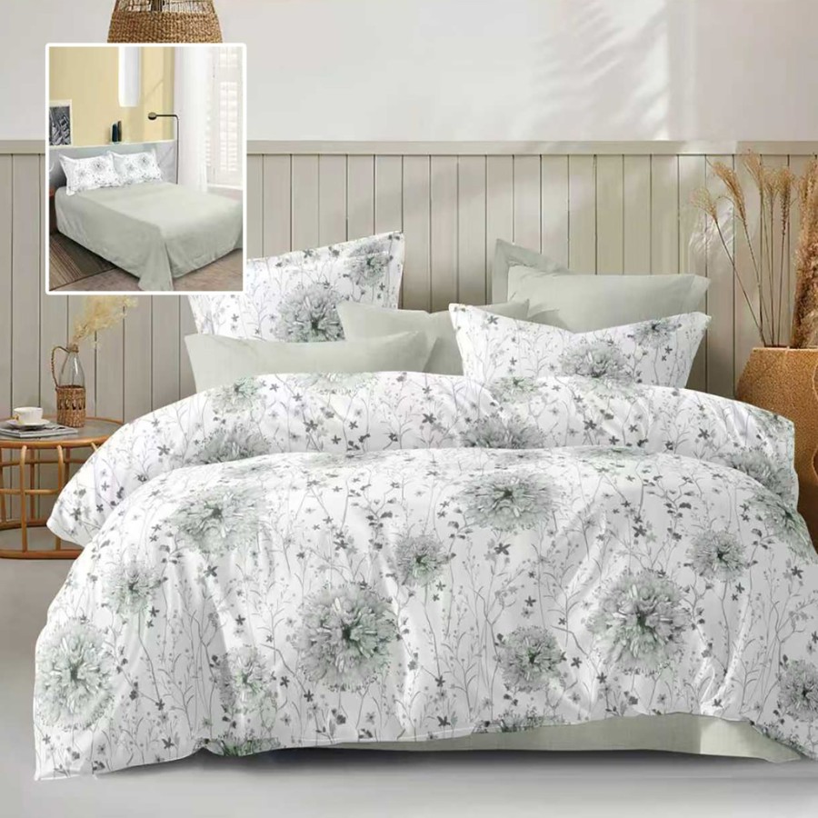 Lenjerie de pat dublu, flori verzi pastel prezinta un imprimeu delicat cu flori si frunze in nuante de verde pastel si gri pe fundal alb. Cearceaful de pat este drept, uni verde pastel deschis, asa cum se observa clar in poza mica aplicata peste imaginea principala. Fetele de perna combina imprimeul floral cu nuante simple de verde pentru un aspect uniform si calm.