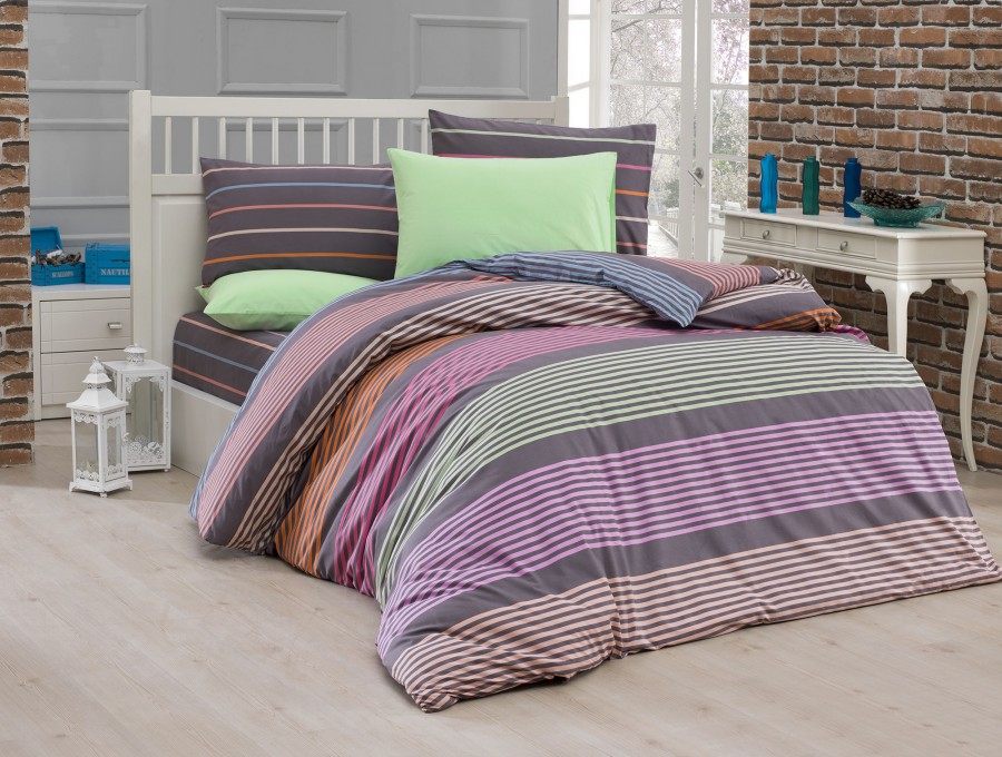 Lenjerie de pat ranforce Bahar Home, model Linea, cu design modern în dungi orizontale multicolore pastelate pe fundal gri închis, aducând un aspect relaxant și elegant dormitorului tău.