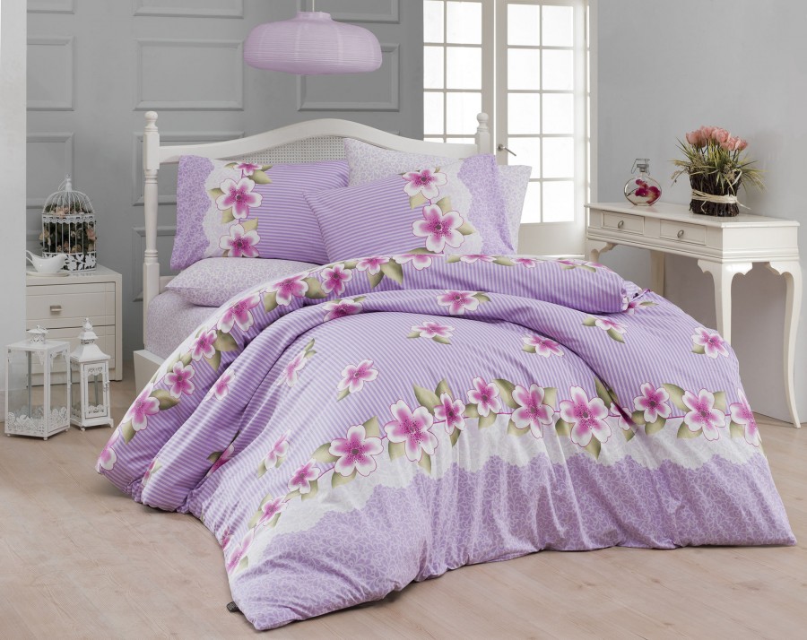 Lenjerie de pat ranforce Bahar Home, model Liva, cu un design elegant în dungi delicate și motive florale mov și alb, aducând un aer proaspăt și rafinat dormitorului tău.