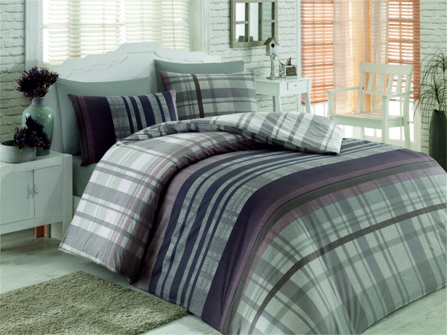 Lenjerie de pat ranforce Bahar Home, model Luke, cu un design clasic în carouri elegante gri și mov, aducând un aer sofisticat și rafinat dormitorului tău.