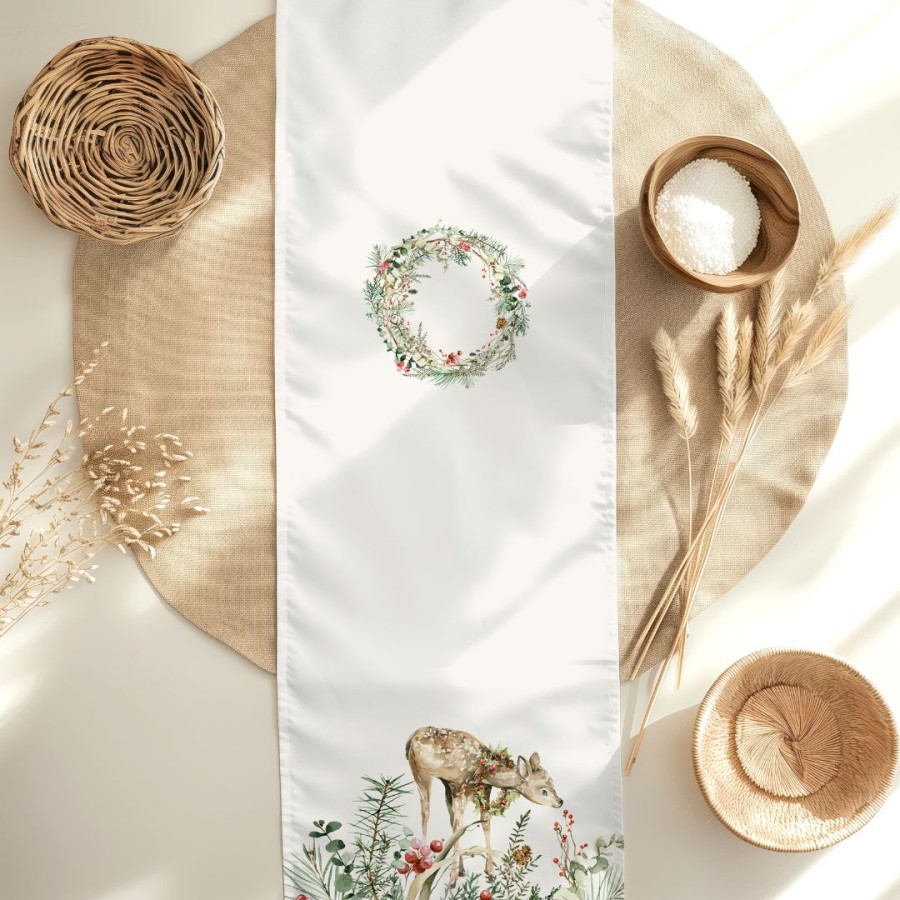 Îmbogățește decorul mesei de Crăciun cu eleganța napronului Jasmin, ce surprinde un peisaj feeric de iarnă cu reni grațioși și elemente naturale. Realizat din bumbac 100%, acest napron de 40x200 cm aduce o atmosferă caldă și rafinată în casa ta, fiind perfect pentru mesele festive.