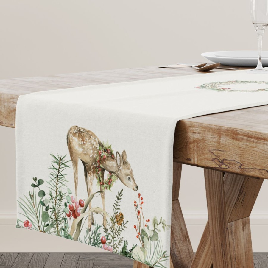 Napron Craciun bumbac 40x200cm cu reni si peisaj de iarna, Jasmin