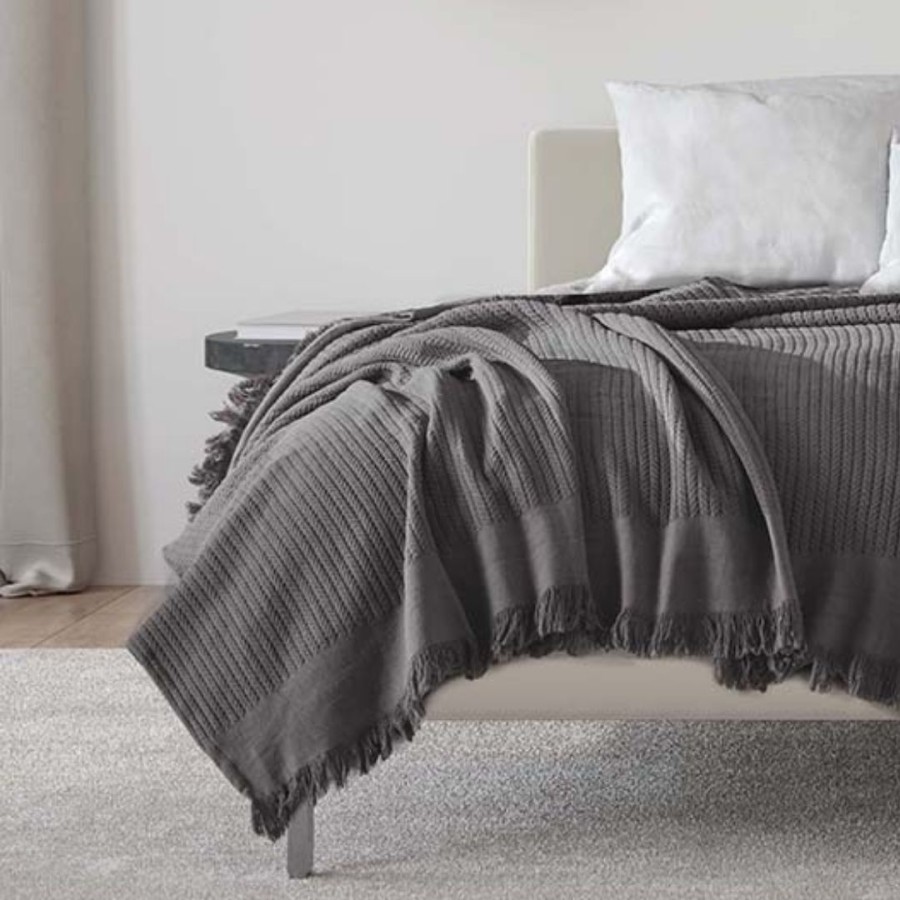 Realizat din bumbac 100%, pledul Habitat este respirabil, durabil și delicat cu pielea. Nuanța de gri antracit se integrează cu ușurință în orice paletă cromatică, oferind un contrast plăcut și o senzație de confort vizual. Poate fi folosit atât ca decor elegant pentru pat, cât și ca înveliș călduros în serile reci petrecute pe canapea.