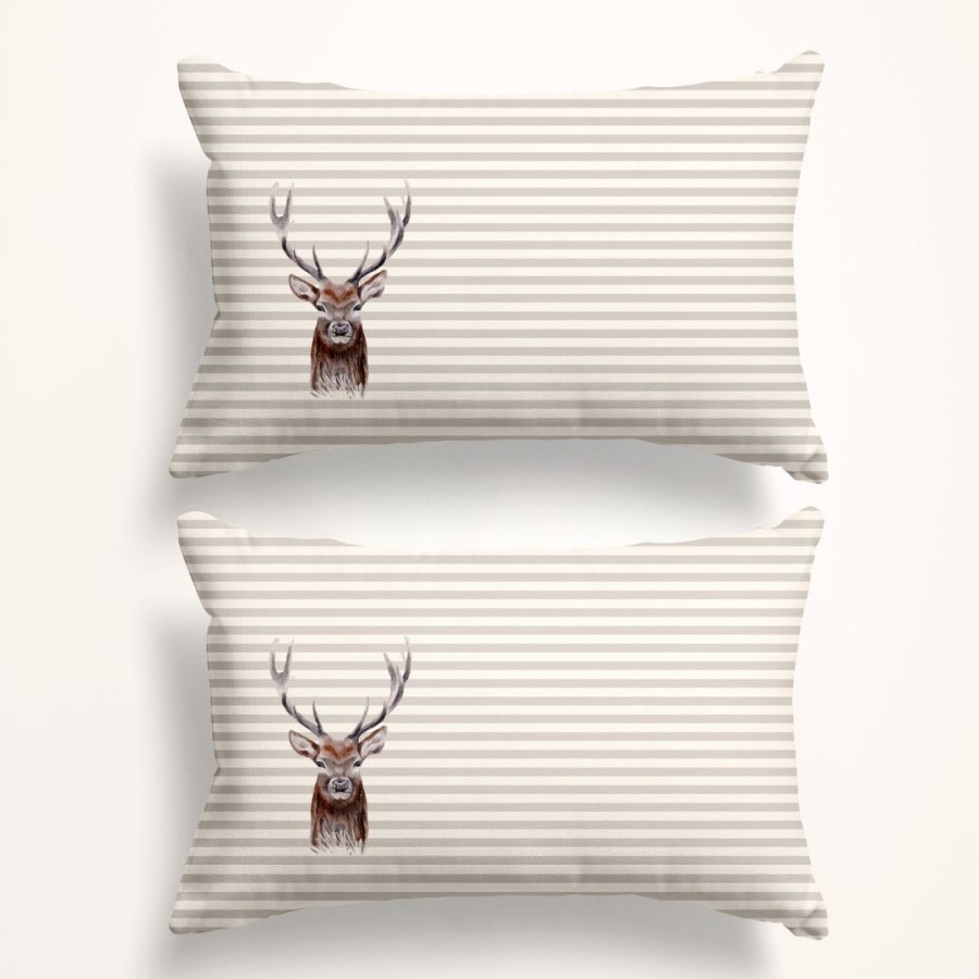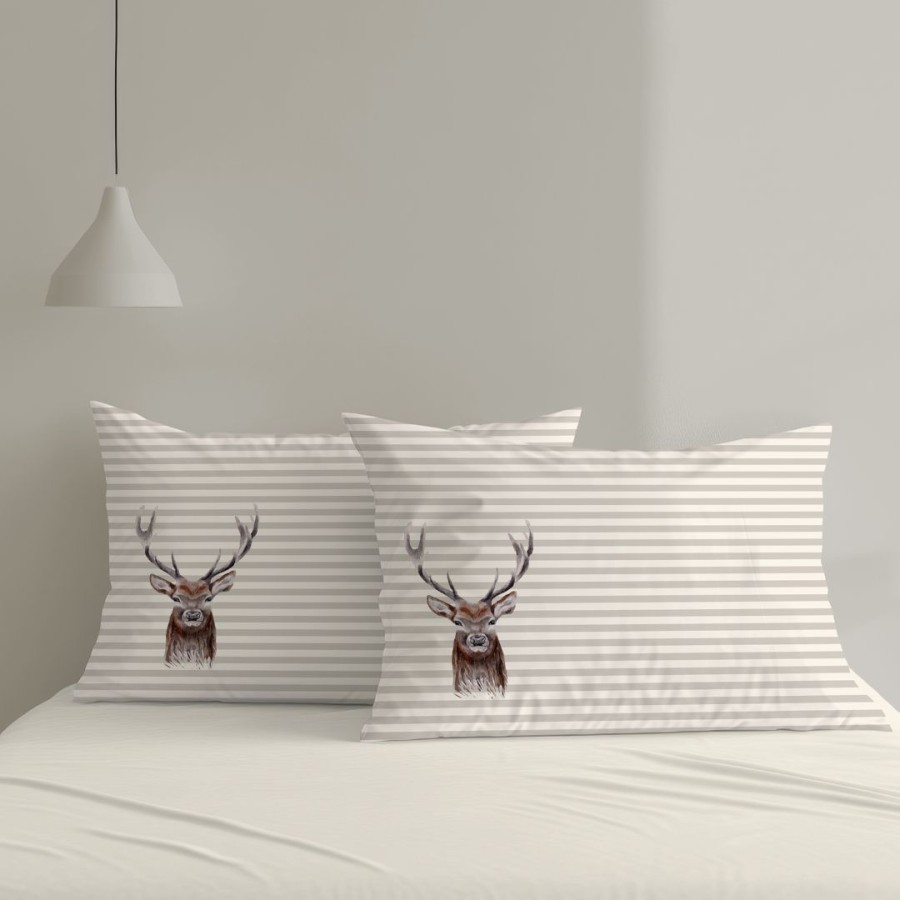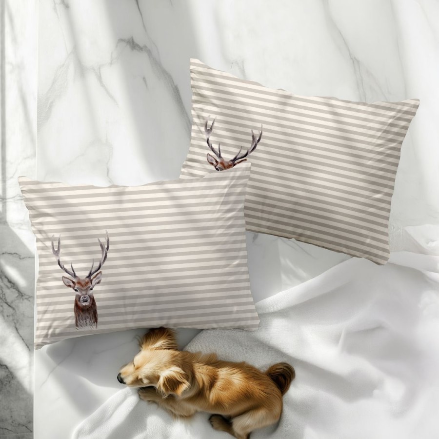 Adaugă o notă de rafinament și căldură în dormitorul tău cu setul de două fețe de pernă Nick, inspirat de eleganța naturală a iernii. Imprimeul cu cerbi, simboluri clasice ale Crăciunului, este redat pe un fundal modern cu dungi fine în nuanțe neutre, creând un echilibru perfect între stil rustic și estetică contemporană.