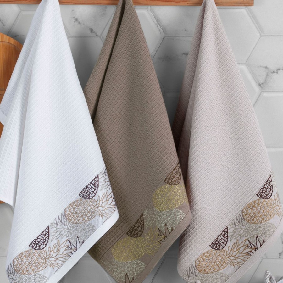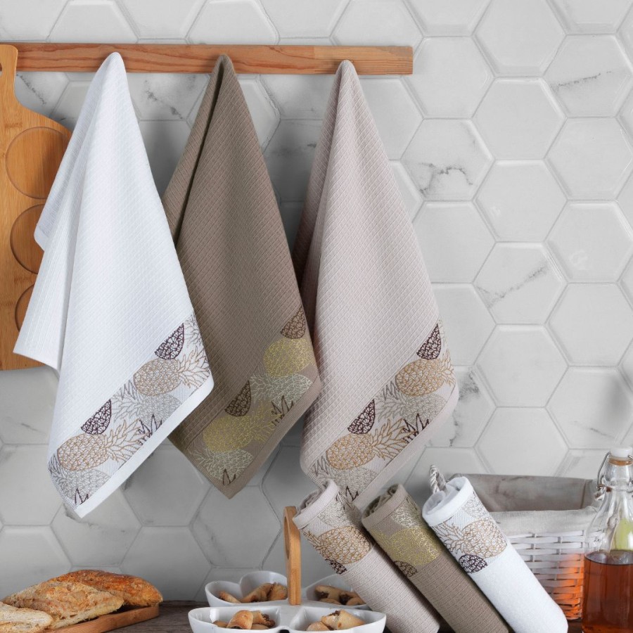 Designul modern, în nuanțe de alb și bej, este înfrumusețat cu detalii subtile cu ananas, aducând o notă fresh și sofisticată în decorul bucătăriei. Prosoapele Pineapple sunt alegerea perfectă pentru cei care doresc să îmbine funcționalitatea cu stilul rafinat.